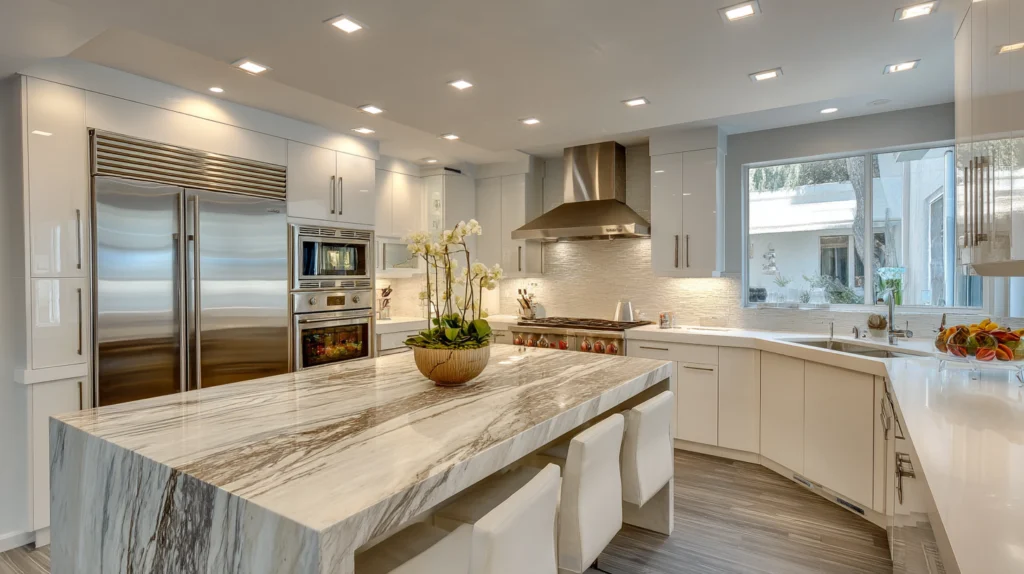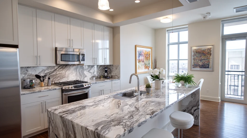 Waterfall edges continue to define modern kitchen countertop installation. By extending the slab vertically to the floor, the design creates a cohesive look across islands and peninsulas. Homeowners appreciate how this approach blends custom countertops with cabinetry and floors. Full height backsplashes made from the same countertop material are increasingly popular, reducing grout maintenance and highlighting the natural movement of stone or quartz.