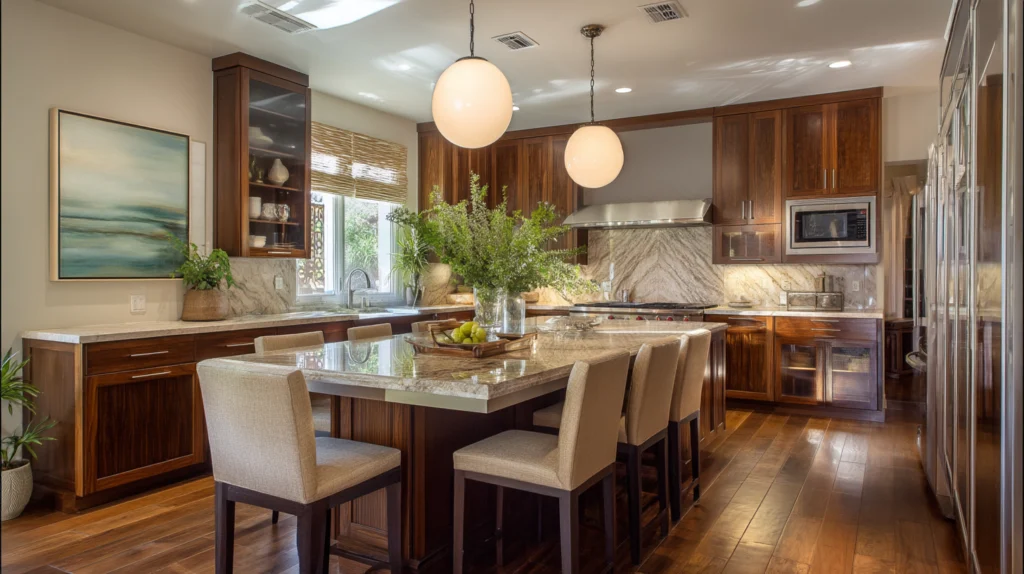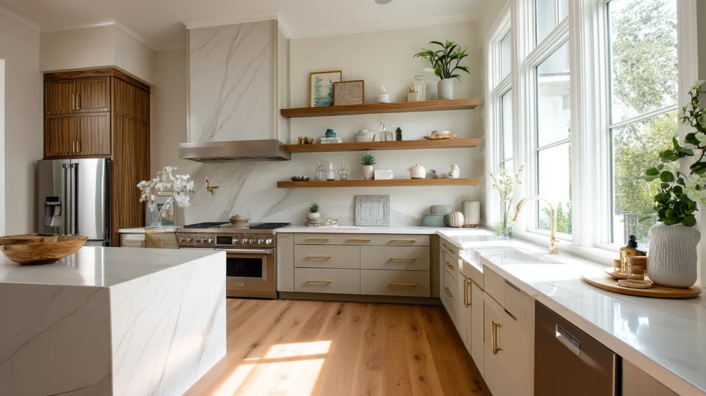 Open shelving and glass cabinets introduce lightness into the kitchen design. They create opportunities to display beautiful dishes, glassware, or décor without overwhelming the space. Many homeowners use open shelving in coffee areas, beside windows, or near the island to break up solid walls. Glass-front cabinets also help reflect light and brighten the room. These ideas work well when balanced with solid wood cabinets to maintain structure and function.