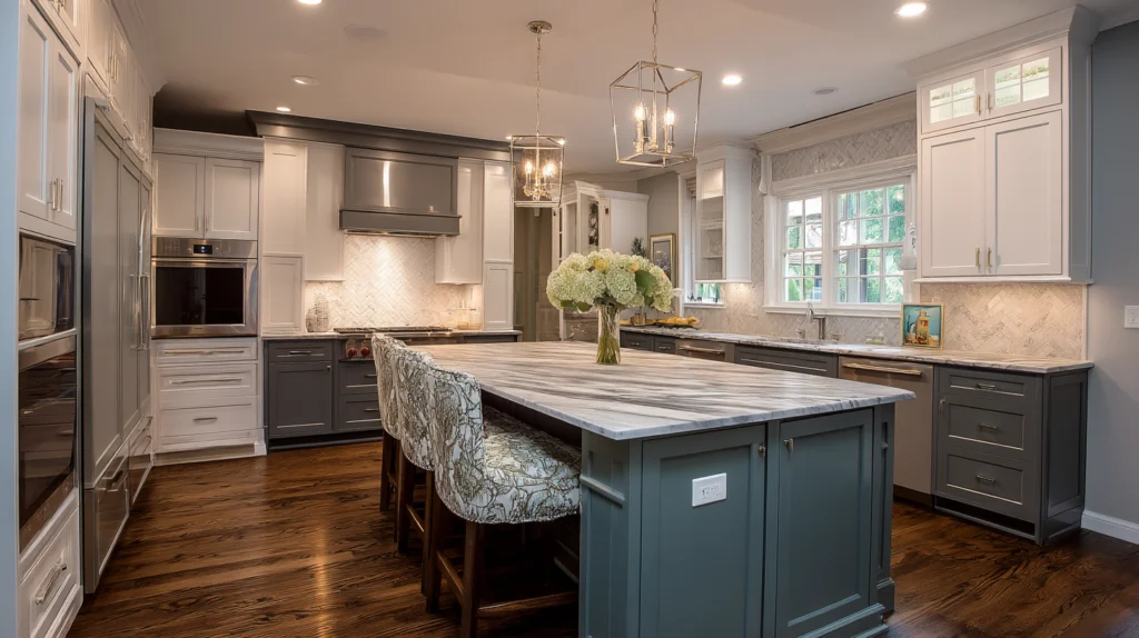 Two-tone cabinets continue to gain popularity because they allow homeowners to explore color and create contrast without overpowering the space. This style uses light cabinets on top and darker cabinets on the bottom, which helps the kitchen feel larger while adding depth and balance. Many homeowners combine bright upper cabinets with charcoal or soft green lower cabinets to create a clean and modern look. This approach enhances the island as well, allowing the kitchen to feel layered and intentional. Two-tone kitchens are flexible and work well in a country home, a traditional house, or a contemporary space. They also create opportunities to highlight certain areas, such as a warm wood island paired with black or navy cabinets around the room. This type of design allows you to express personality while keeping the kitchen cohesive.